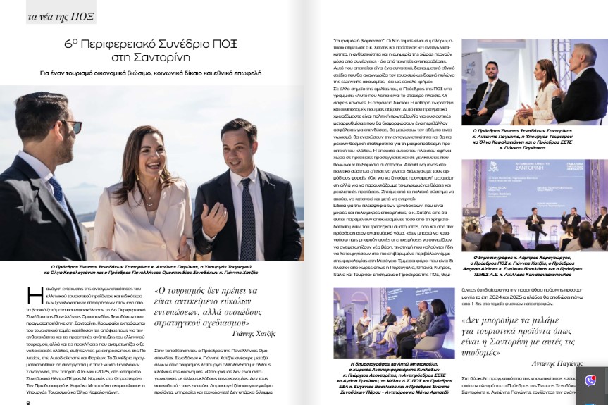 Αφιερωμένο στη Σαντορίνη είναι το τεύχος Ιουνίου του περιοδικού Greek Hotelier της Π.Ο.Ξ. που έχει αναρτηθεί στο website της, περιλαμβάνοντας μεταξύ άλλων πλήρες ρεπορτάζ με τις τοποθετήσεις και δηλώσεις των συμμετεχόντων στο 6ο Περιφερειακό Συνέδριο της ΠΟΞ που πραγματοποιήθηκε στις 4 Ιουνίου στη Σαντορίνη καθώς και άρθρο του προέδρου της Ένωσης Ξενοδόχων Σαντορίνης Αντώνη Παγώνη σχετικά με τις προκλήσεις και προοπτικές της Σαντορίνης.