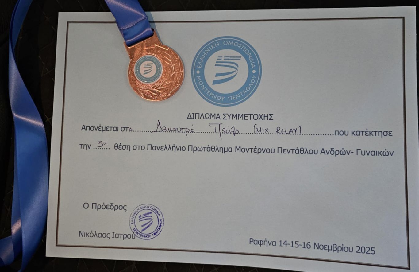 Την 3η θέση στο Πανελλήνιο Πρωτάθλημα μοντέρνου Πεντάθλου κατέκτησε ο συμπατριώτης μας Παύλος Δακουτρός ο οποίος αυτό το μήνα συμπληρώνει 20 χρόνια ενεργούς και επιτυχημένης παρουσίας στο πένταθλο, οπότε κι εμείς του ευχόμαστε επιτυχίες και ακόμη περισσότερες εμπειρίες στην αθλητική σταδιοδρομία του!